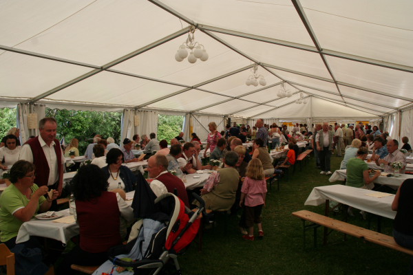 Hoch über Tripsdrill auf dem Michaelsberg sang das Ensemble unterstützt von Robinson-Trommlern drei Stunden im Zelt zum Weinfest.