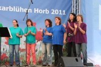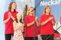 Am letzten Nachmittag der Gartenschau in Horb hatten wir einen Auftritt im Hauptzelt der Gartenschau. Zuvor reisten wir mit der Schaubahn mit realen Fahrkarten zu unserem Probelokal, wo wir uns einstimmten und die neuen t-Shirts regebogenartig auf den Chor verteilten