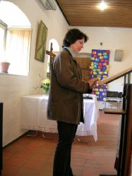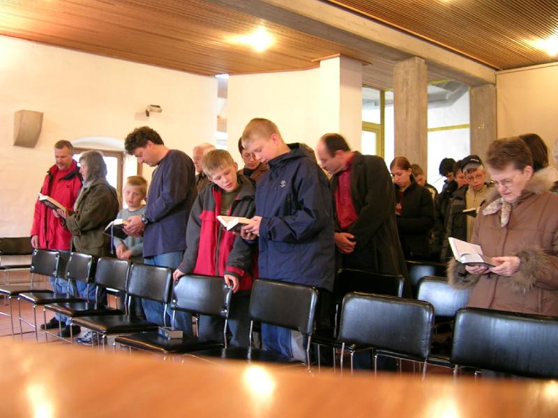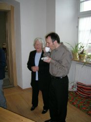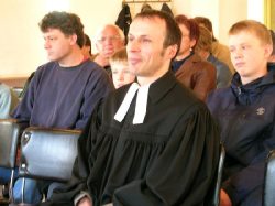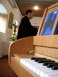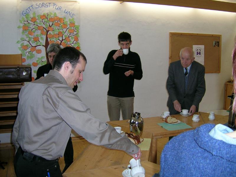 Pfarrer Eberhardt kam als Pfarrvikar nach Horb (Bildechingen), wurde kurz darauf zum zum Pfarrer zur Anstellung und bekam, als diese Zeit vorrüber war, die neu eingerichtete zweite Pfarrstelle in Horb. Nach vielen Jahren in Horb zog es ihn weiter und als er erfuhr, dass in seiner Heimatgemeinde die Pfarrei vakant sei, da bewarb er sich in die Heimat und wurde dort mit offenen Armen empfangen. Das erste Bild zeigt ihn mit seinem Koffer, der typisch für ihn ist. Ihn hat er in seiner Studentenzeit in Tübingen auf dem Sperrmüll aufgetan und trägt darin seit er Talare trägt seinen Talar darin zu den Gottesdiensten. Der erste Gottesdienst führte uns nach Norstetten in den Gottesdienstraum im Schloss. Im Anschluss gibt es dort immer Kirchenkaffee, den wir wie immer etwas hecktisch zu uns nehmen mussten, weil gleich im Anschluss der zweite Gottesdienst in Eutingen stat fand. Hanno und ich haben sehr viele Gottesdienste zusammen gestaltet, zumeist in Eutingen und -Nordstetten. Er als Pfarrer und ich immerhin als Organist ;-).